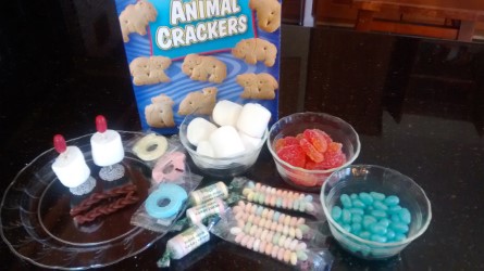 There is so much symbolism in this week’s parsha! The candy coins symbolize the purchase of Maaras HaMachpela, the first land purchase by a Jew in Israel. If you can find silver coins in your store (maybe they are already stocking for Chanukah!), that is even better. The blue jelly beans symbolize the water that Rivka offers Eliezer and his camels, proving her worthy to marry Yitzchak. The candy rings and bracelets symbolize the gifts that Eliezer gives Rivka (for a healthier alternative, “bracelets” can be cut using colorful peppers). To symbolize the three miracles that returned to Sarah’s tent when Rivka enters, you can use marshmallows (for the cloud and for the dough rising) and you can make candles by inserting a toothpick into a chocolate nonpareil, then sliding a marshmallow over the toothpick, topping it off with a red jelly bean. You could also use marzipan challahs or braid licorice ropes to look like challahs. [See photo above] Candy hearts could be served this week to symbolize the marriage of Yitzchak and Rivka. Finally, animal crackers could be used to recognize the role the camels play in this week’s parsha.